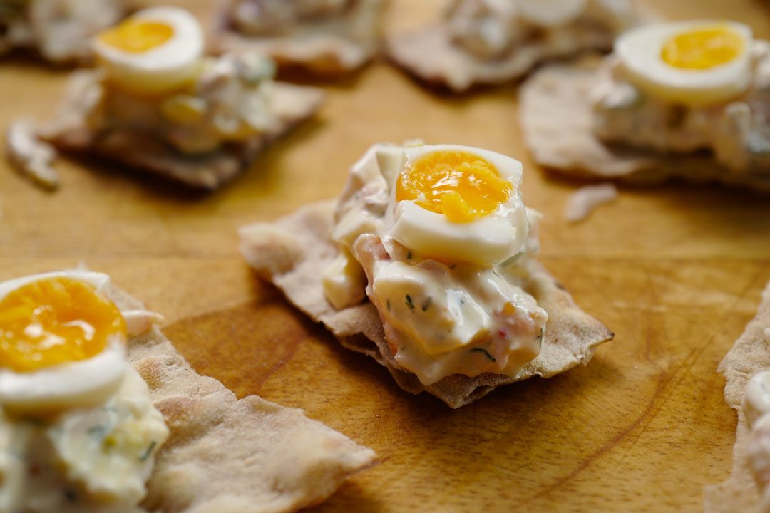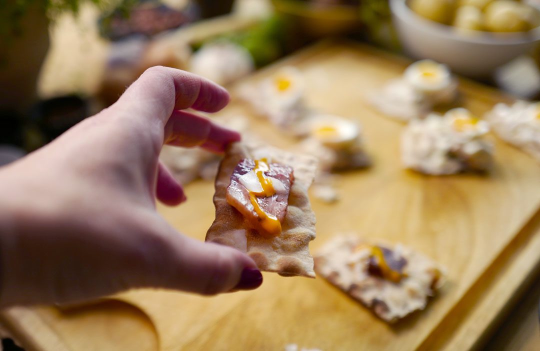 Men er det slik at vi hopper rett til hovedretten? Skal vi ikke ha en liten «beta» før vi skal spise? Hva gjør vi mens vi venter? Jo, da snacker vi! Og det på den enkleste måten. Jeg kjøpte en boks tunnbröd – en mellomting mellom flatbrød og knekkebrød. Det er helt perfekt å bryte i passe biter. På biten kan du legge hva du: Skinke, ost eller hva med dette: