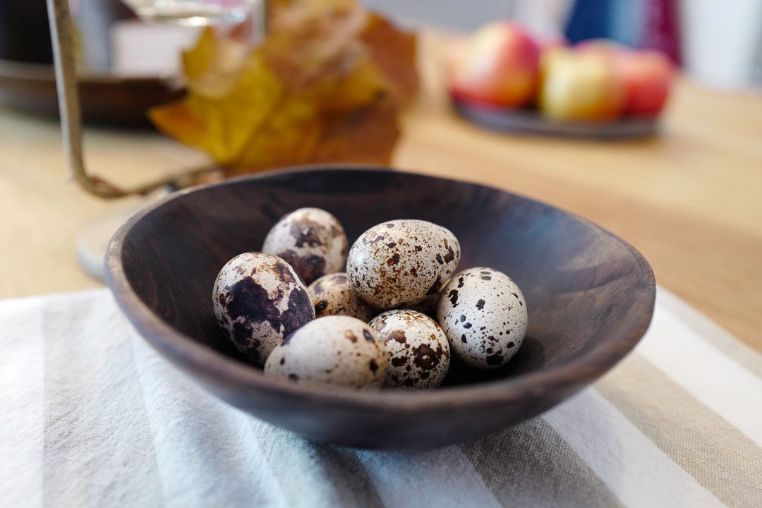 Til disse to ferdiglagde rørene kokte jeg vaktelegg i tre minutter, avkjølte dem godt i kaldt vann, skrelte dem og delte dem i to.