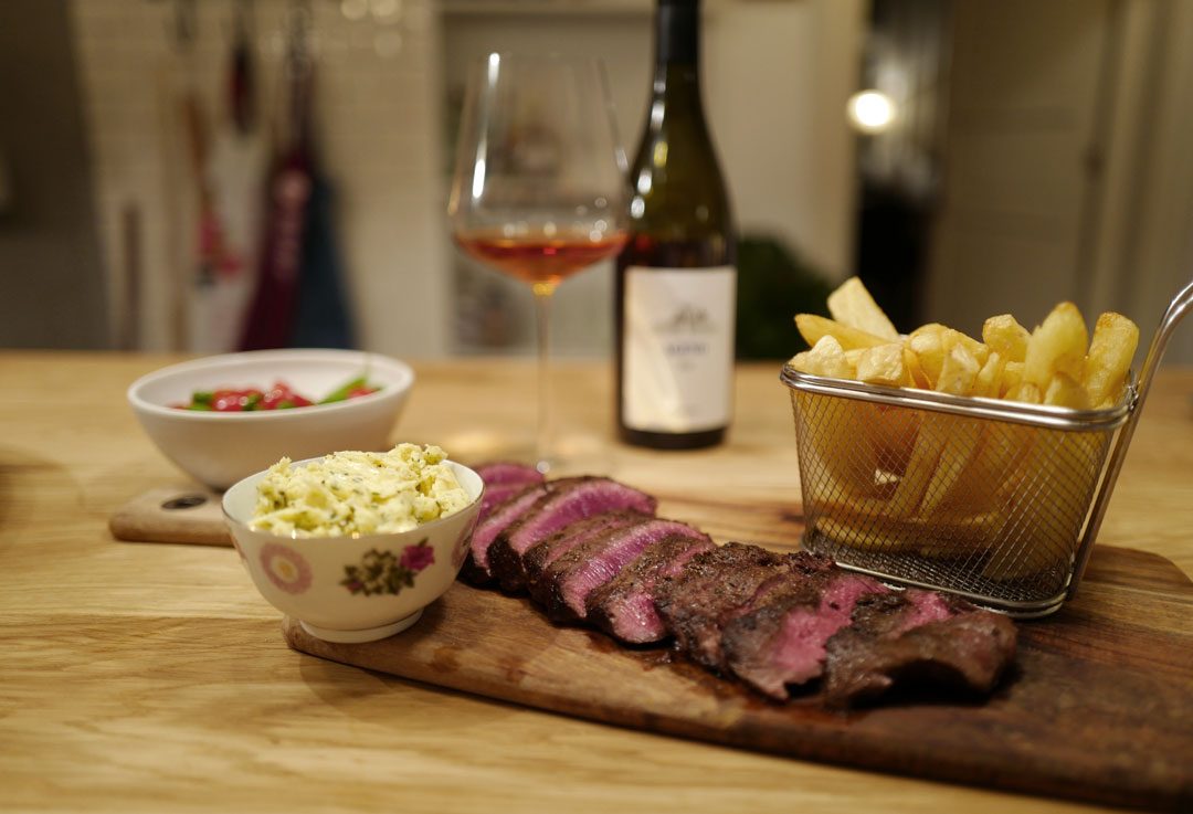 Mat: Flat Iron steak, pommes frites, kryddersmør med masse sitrus, tomatsalat.
