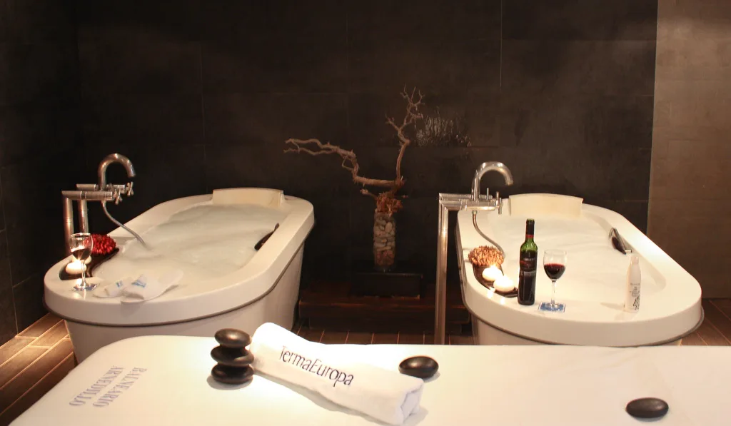 Hva er linken mellom kurbad og vin? De har jo selvsagt vinterapi på menyen. Vi er tross alt i La Rioja! Det fungerer slik: Du blir først massert i vindrueolje som dufter helt fantastisk. Så blir du plassert i skumbad tilsatt drueolje. Mens du sitter der i mørket med levende lys plasseres en flaske lokal rødvin og vinglass på kanten av badekaret.