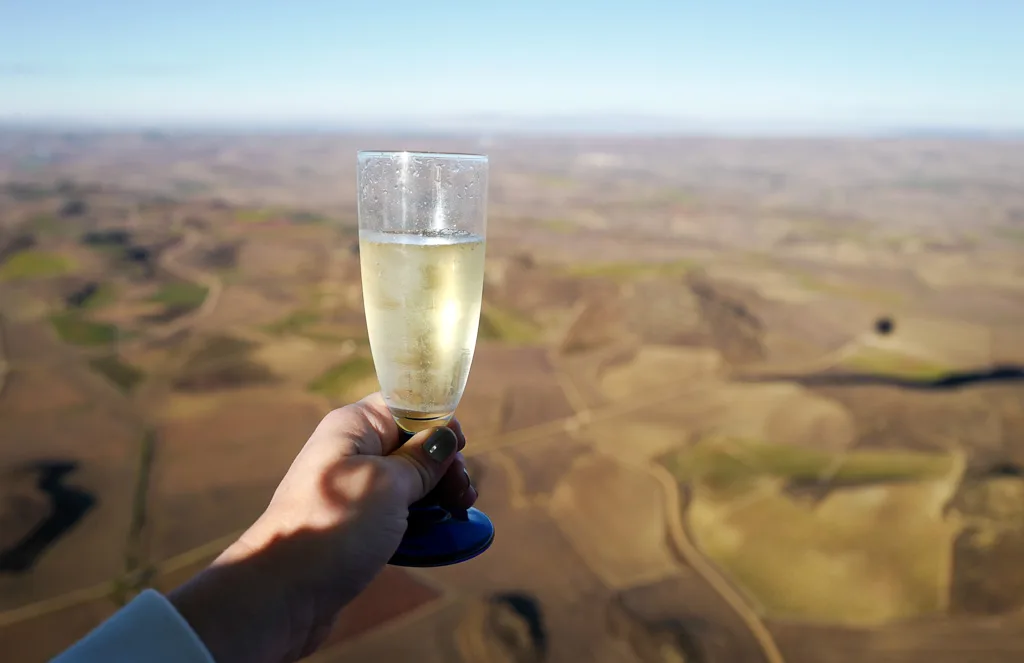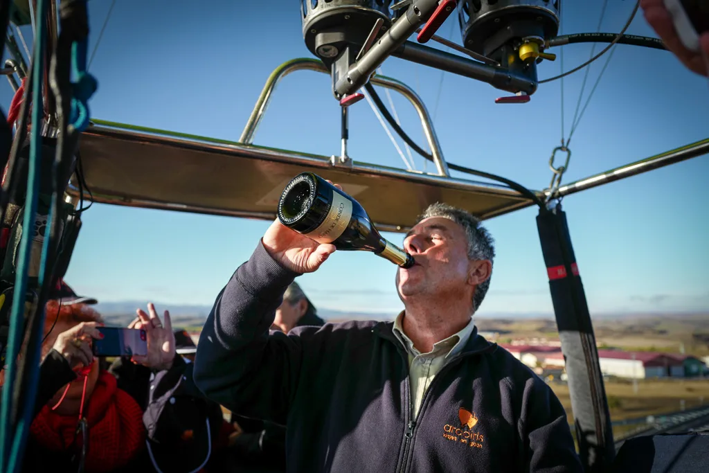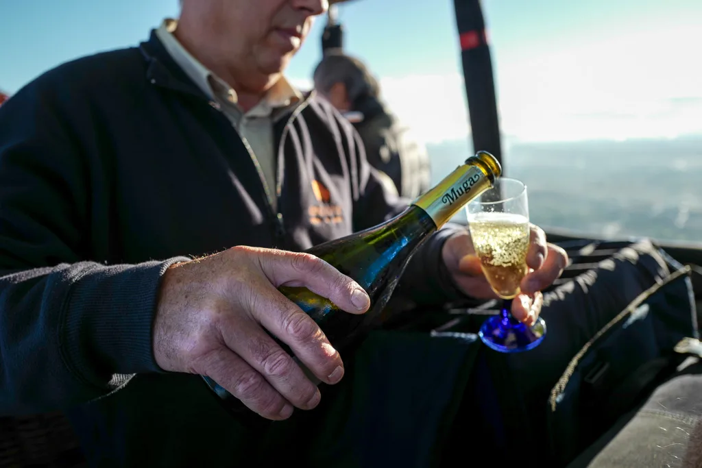 I løpet av ballongferden fikk vi servert et glass lokal cava. Ballongføreren førte også ballongen ned til vinrankene på et tidspunkt i turen, og plukket en gren fra buskene. Snakk om presisjon!