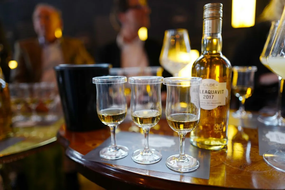 Til desserten får vi smake Gilde Ekstra Modnet Juleaquavit 2017.
