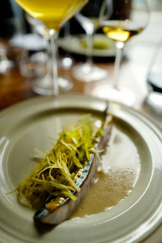 Først får vi en fabelaktig rett med makrell, eple, selleri, sopp, eggeplomme og røkt saus. Helt nydelig!