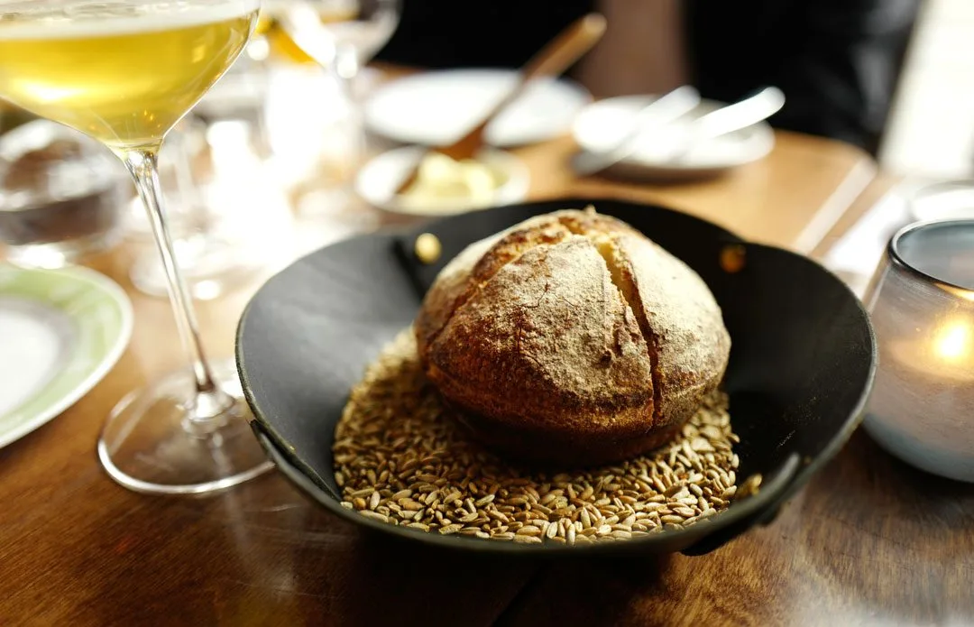 Brød laget på økologisk mel fra Holli Mølle servert med kyllingsmør (OMG!) settes på bordet.