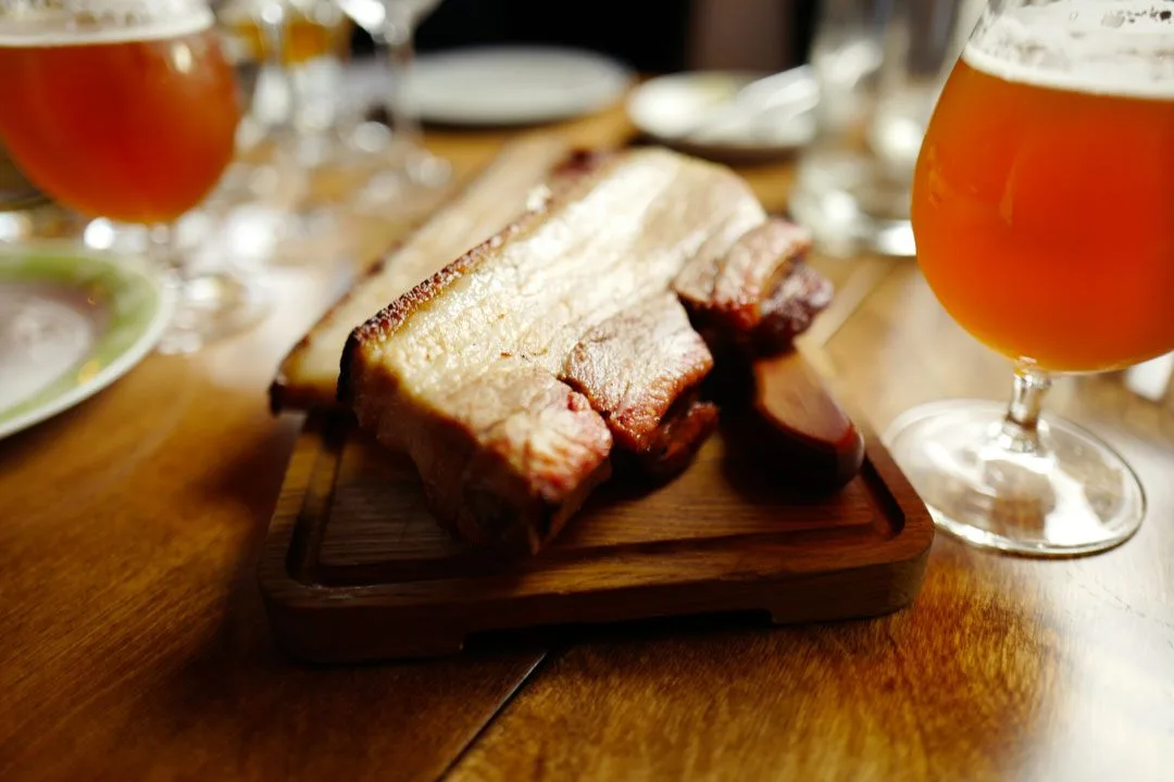 Vi får også syrlige plommer og puffet hvete samt en deilig sky til retten. Øl og Gilde juleaquavit i glassene.
