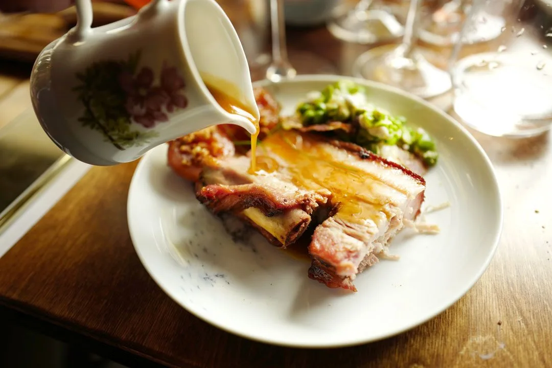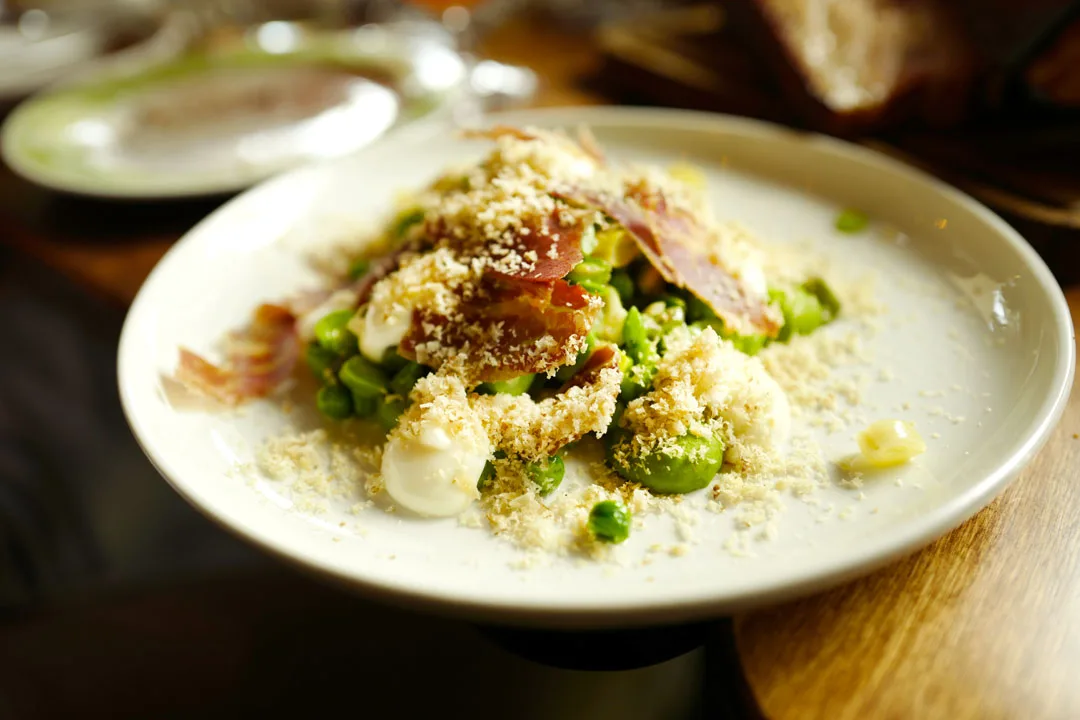 Så kommer ribben fra Åmot gård inn fra kjøkkenet. Den er tilberedt i Jospergrillen og serveres med bønner, erter, spekeskinke og valnøtter.