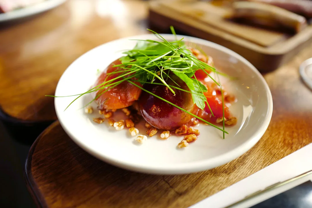 Topphem er søsterrestaurant til gourmetstedet Bokbacka i Skovveien. Jeg digger stedet med en gang jeg kommer inn i lokalet. Dette er et sted jeg kommer til å vanke. Det er en superkoselige avdeling med gamle fløyelsstoler og -sofaer ved baren og i spiseavdelingen sitter man rett og slett veldig behagelig med utsikt til åpent kjøkken. Relaxed og med ufattelig god mat. Nå får vi servert en spesialmeny til dette eventet, men hvis dette viser stilen på maten som serveres på Topphem (noe det vel gjør) så kan jeg melde om kvalitet på øverste hylle.