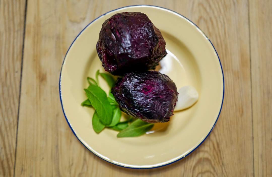 I stedet for kalvekjøtt har jeg brukt bakte beter som jeg så har stekt på samme måte som et stykke godt kjøtt, med smør, hvitløk og urter til hinnen har fått en deilig smak. Bakingen gjør at rødbeten taper væske og får en fastere konsistens. Det er dette jeg er ute etter. Kokt rødbete vil ikke gi samme resultat. De er for «vannete»