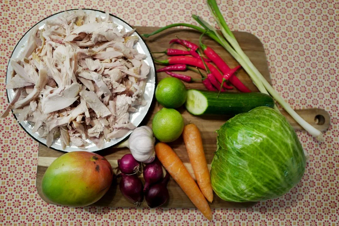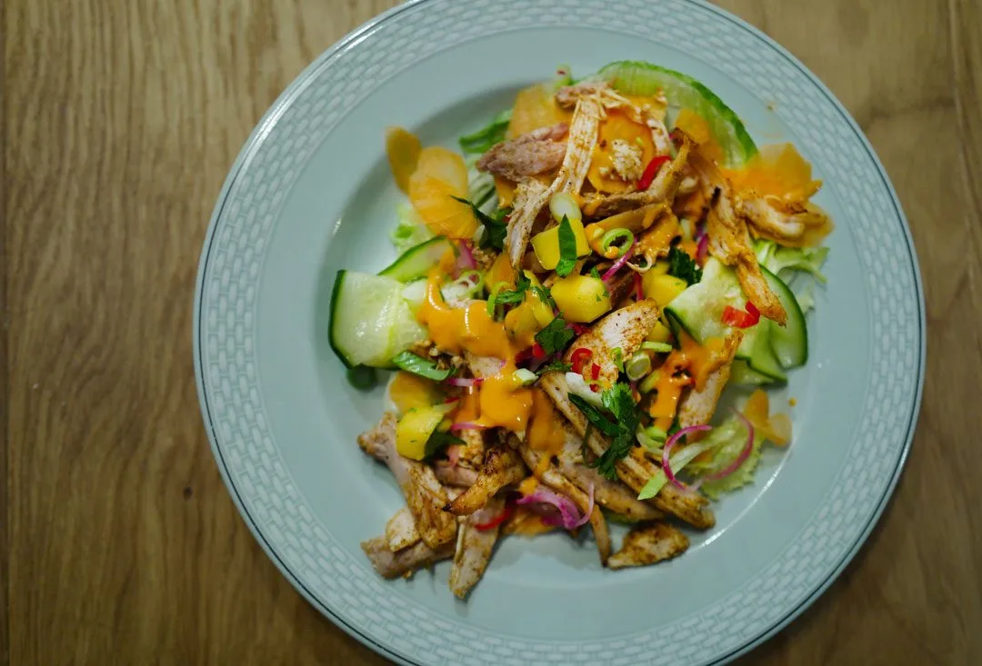 Mangosalat: Velg moden mango. Får du ikke tak i det blir det en kjedelig rett. Gå da heller for moden ananas. Skjær mango i små terninger. Press saft av 1/2 -1 lime over. Bland inn tynne skiver av chili og masse frisk koriander.