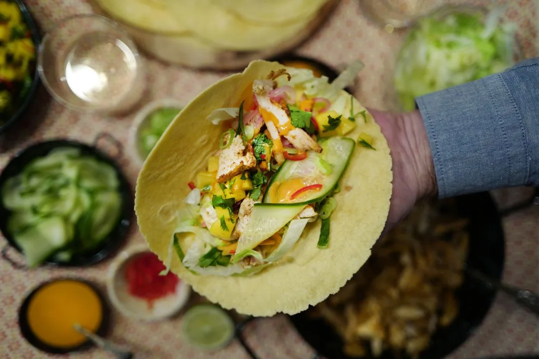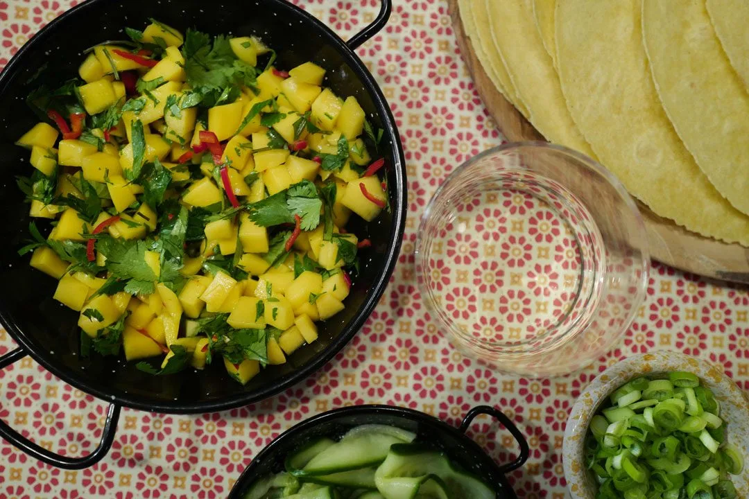 Hva har jeg så brukt deler av restene til? Jo, jeg har laget en tacovariant med myke maislefser, sterk chilidressing, mangosalat og et par hurtigsyltede elementer.
