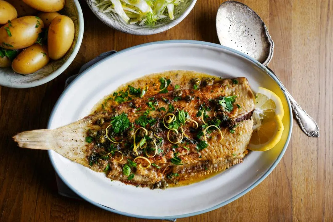 Mens fisken er i ovnen har du smøret fra gryta i pannen og tilsetter (vaskede) kapers, litt sitronzest, litt -saft og bladpersille.