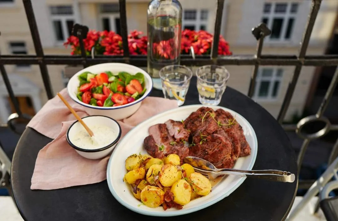 Salaten: bland agurk, tomat, jordbær og basilikum i en bolle. Hell litt god olivenolje over samt et par svis sitronsaft.