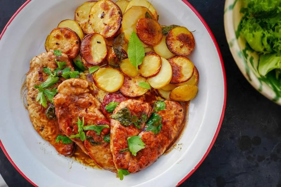 Potetene: Vask potene og del dem i tykke skiver. Kok i lettsaltet vann til de er møre. Renn av vannet og ha skivene i en ildfast form. Dryss over flaksalt og god olivenolje. Legg noen salvieblader i formen sammen noen hvitløksfedd. Sett i ovnen på 180 grader i ca 20 minutter til potetskivene er gylne.
