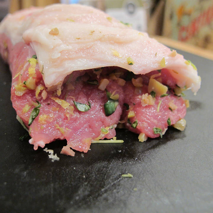 Lag et fyll bestående av grønne oliven. Bruk oliven med stein, og ikke de kjipe smaksløse stenfri du får på glass. Jeg kjøpte faste og deilige oliven som var marinert i urter. Du får det på Ica og lign steder, men innvandrersjapper er de beste stedene å få tak i gode oliven. Fjern steinene og hakk olivnene. Finhakk et par ss timianblader, samt riv skallet av 1/2 sitron. Bland dette godt og fyll hullet i lammet med blandingen. Lukk hullene på hver side av fileten med hyssing eller tannpirker (uten smak).
